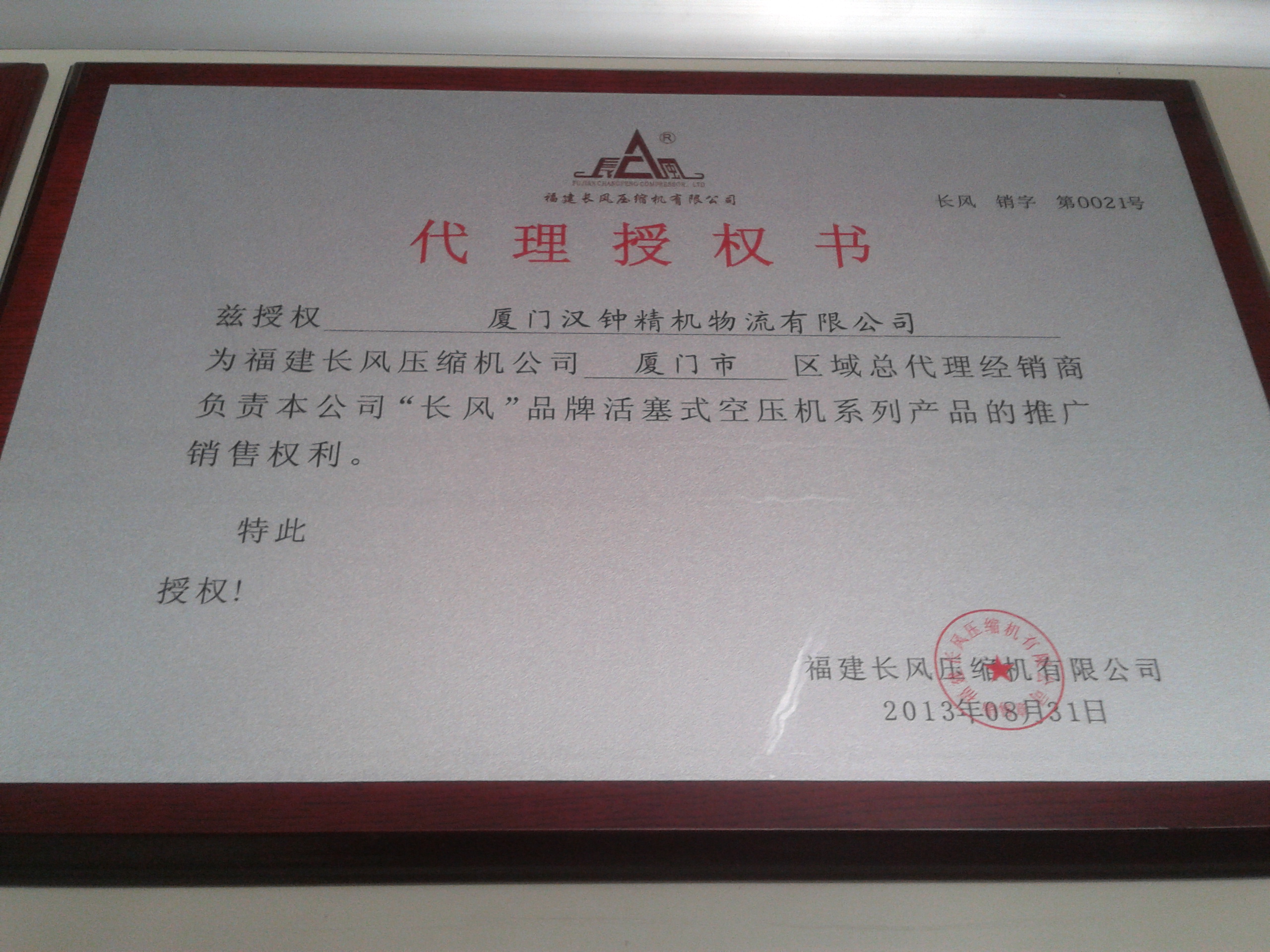 2013年8月福建建陽(yáng)長(zhǎng)風(fēng)授權(quán)廈門漢鐘精機(jī)有限公司----總代理經(jīng)銷權(quán)-品牌代理