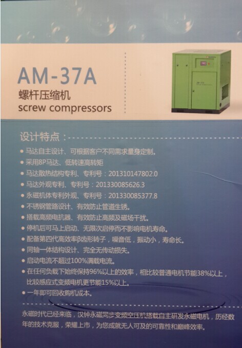漢鐘精機(jī)做為國內(nèi)流體機(jī)電產(chǎn)業(yè)的領(lǐng)導(dǎo)者,此次參展的產(chǎn)品有工頻螺桿式空壓機(jī)、變頻螺桿式空壓機(jī)、永磁變頻螺桿式空壓機(jī)、以及漢鐘機(jī)頭;其中永磁變頻螺桿式空壓機(jī)的超級節(jié)能為眾多參展客戶所吸引。